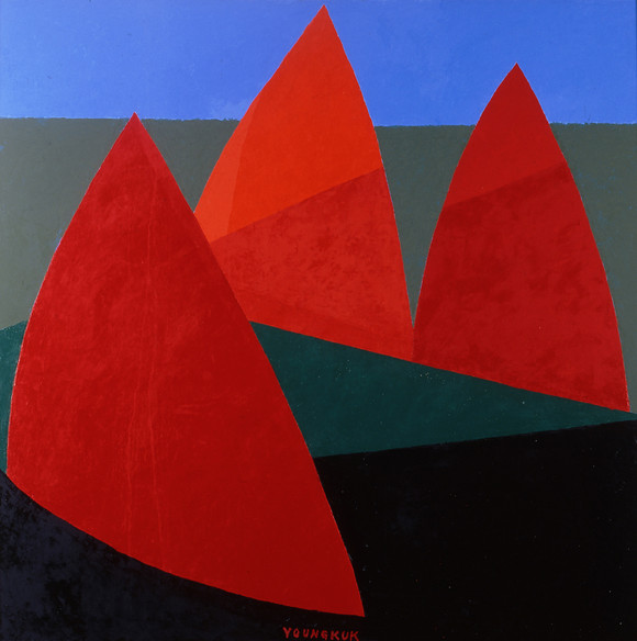 첫 번째 섹션 ▲‘예술은 ( ) 시작하는가’는 장르와 형식을 해체하고 매체를 실험하며 예술의 경계를 확장해온 예술을 살펴본다. 유영국 〈산〉(1997), 박현기 〈무제〉(1993), 권오상 〈아구스타〉(2008), 구본창 〈태초의 #13〉(1998) 등을 통해 관습을 의심하고 형식을 전복하며 보이지 않는 것을 드러낸 한국 현대미술의 흐름을 조망한다.
