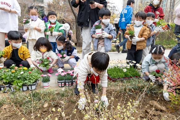 어린이들이 직접 꽃을 심으며 정원 만들기에 참여하고 있다. 사진=마포구청