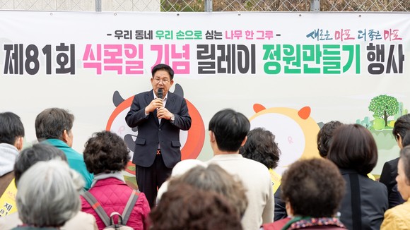 식목일 기념 릴레이 정원만들기 행사에서 인사말을 하는 박강수 마포구청장. 사진=마포구청