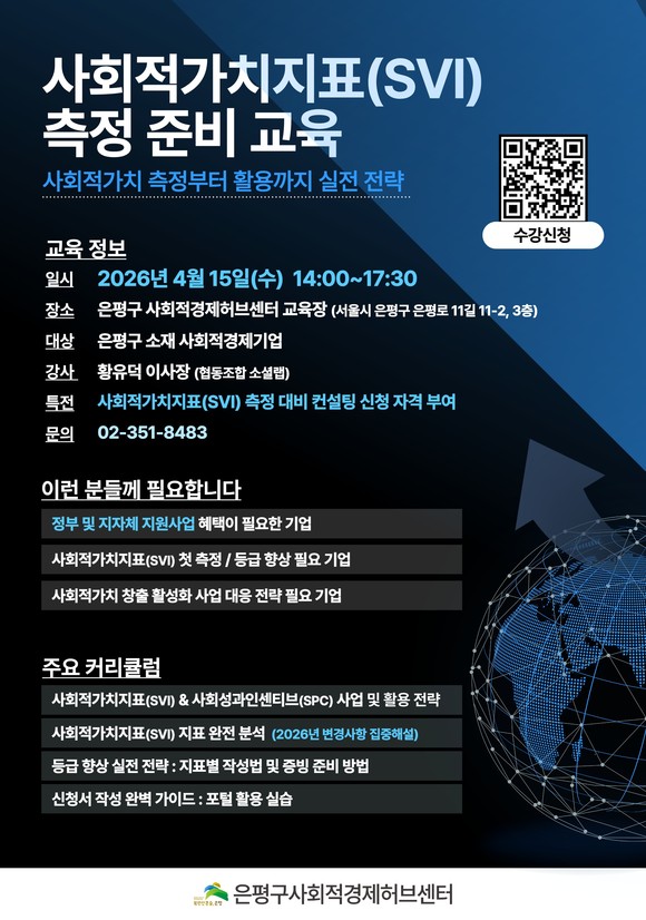 교육 대상은 은평구 소재 사회적경제기업이며, 오는 14일까지 신청 가능하다. 참여를 희망하는 기업은 홍보물 내 큐알(QR)코드를 통해 온라인으로 신청할 수 있다. 자세한 사항은 은평구 사회적경제허브센터로 문의하면 된다.