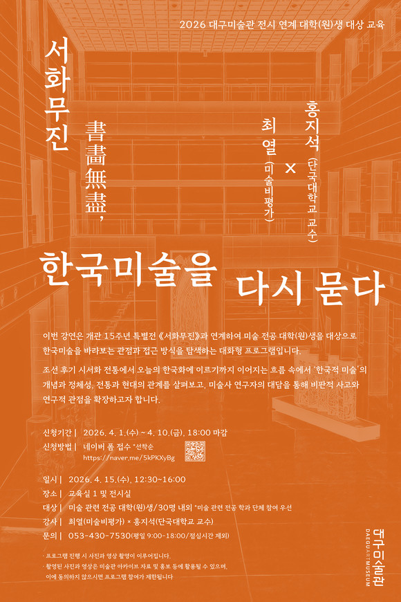 대구문화예술진흥원 대구미술관은 개관 15주년 특별전 서화무진과 연계하여 미술 전공 대학(원)생을 대상으로 한 교육 프로그램 ‘서화무진, 한국화를 다시 묻다’를 오는 4월 15일(수), 오후 12시 30분부터 4시까지 운영한다.