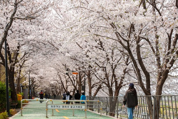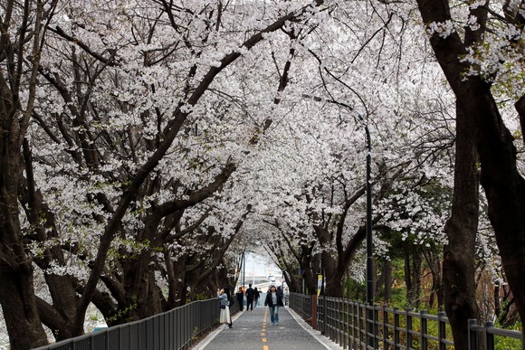 성동구 송정 제방길에서 4월 3일부터 4일까지 ‘제9회 송정마을 벚꽃축제’가 개최된다. 벚꽃이 만개한 ‘송정 제방길’ 모습. 사진=성동구청