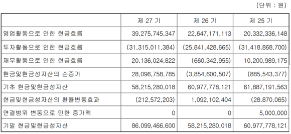 교촌에프앤비의 현금흐름표를 보면 2025년 한 해 동안 영업활동으로 약 392억원의 순유입을 기록했지만, 투자활동에서는 약 313억원이 순유출됐다. 여기에 차입과 상환, 배당 지급 등이 반영된 재무활동 현금흐름에서 약 201억원이 순유입되면서 기말 현금 보유액을 유지한 구조다.