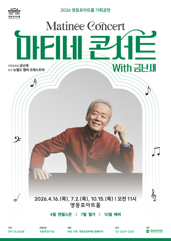 서울 영등포문화재단(대표이사 이건왕) 영등포아트홀은 2026년 4월, 7월, 10월 총 3회에 걸쳐 새롭게 단장한 ‘마티네콘서트 With 금난새’를 선보인다.