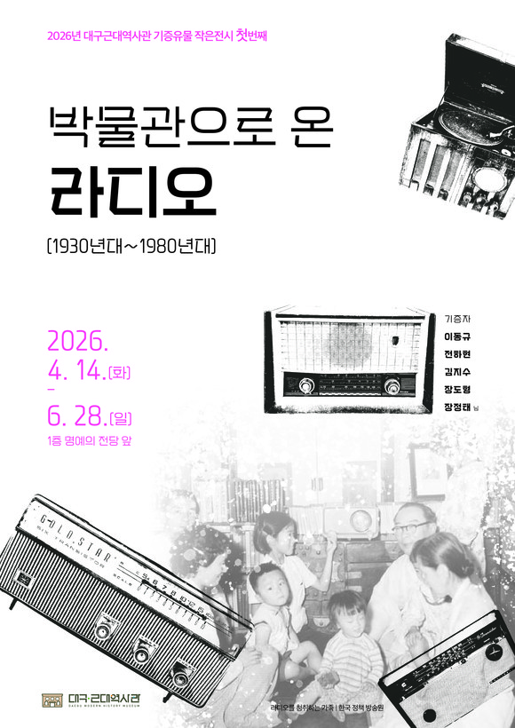 (재)대구문화예술진흥원 박물관운영본부 소속 대구근대역사관은 2026년 제1차 기증유물 작은전시로 ‘박물관으로 온 라디오(1930년대~1980년대)’를 4월 14일(화)부터 6월 28일(일)까지 1층 명예의 전당 앞에서 개최한다.