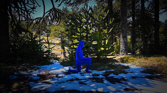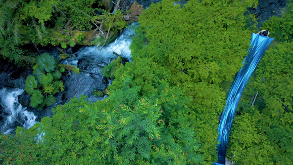 이 푸른 천은 물줄기(강)를 시각적으로 상징하며, 트라옌코의 생명력이 숲을 따라 멀리까지 흐르고 영향을 미친다는 마푸체(Mapuche)족의 세계관을 은유적으로 표현한다. 짙은 코발트 블루 드레스를 입고 숲으로 들어가는 한 사람이 있다. 뒷모습을 보면 마치 강의 여신을 연상시키지만 성별은 중요치 않다. 퍼포먼스의 후반부에서 작가는 천을 끌고 흐르는 강물로 직접 들어간다. 마침내 폭포 아래에서 몸을 담그며 사라진다. 작가는 물(Ko)을 영토, 치유, 생명의 근원으로 여기며, 코발트 블루 드레스는 강을 상징한다.