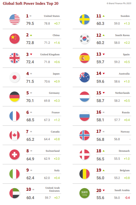 2025년 현재, 한국은 이 분야에서 눈부신 성장을 보이고 있다. 브랜드 파이낸스(Brand Finance)의 ‘글로벌 소프트 파워 인덱스 2025’에 따르면, 올해 2월 기준 한국의 순위는 12위(60.2점)다. 전년 대비 3계단 상승했는데, 이는 상위 100개국 중 가장 빠른 상승세다.
