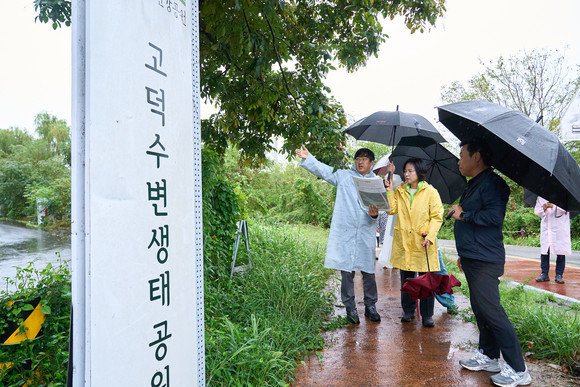 이수희 서울 강동구청장은 10월 13일(월) 오후, 가을비가 내리는 가운데 ‘강동한강그린웨이’의 본격적인 추진을 위한 한강 수변 사업의 주요 대상지 현장을 직접 점검하고, 고덕천 수변활력거점 조성공사(2단계)와 망월천 종합 정비사업 현장을 잇달아 살폈다.