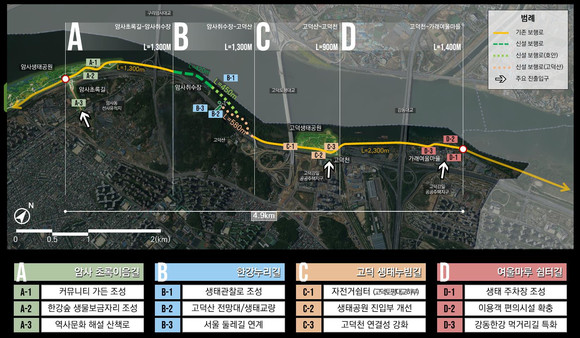 ‘강동한강그린웨이’는 한강 수변의 생태·문화를 유기적으로 연결해 주민 삶의 질을 높이는 수변활력 인프라 구축 사업이다. 구는 사업 구간마다 특색 있는 인프라를 구성해 지리적·문화적 특징과 지역경제가 가장 큰 시너지를 낼 수 있는 전략을 모색해 추진할 계획이다. 서울 암사동 유적부터 암사생태공원까지의 ‘암사초록이음길(A구간)’에서는 역사 문화 해설이 있는 산책로와 ‘한강숲 생물보금자리’, ‘커뮤니티 가든’을 조성해 지역 자산과 생태교육·참여 정원을 연계할 계획이다. 암사취수장에서 고덕산까지 이어지는 ‘한강누리길(B구간)’은 생태관찰로와 고덕산 전망대·생태교량, 서울둘레길을 연계해 관찰·조망·순환 보행 네트워크를 강화한다. 고덕산에서 고덕천까지의 ‘고덕생태누빔길(C구간)’은 고덕토평대교 하부 자전거쉼터와 생태공원 진입부 개선, 고덕천과의 연결성을 강화해 보행·자전거 이용의 연속성과 수변 접근성을 높인다. (추가함) 마지막으로 고덕천에서 가래여울마을까지의 ‘여울마루 쉼터길’(D구간)은 자전거 라이더들의 쉼터로 사랑받는 공간으로, 이용객 편의시설을 확충하고 특화 먹거리길을 조성할 계획이다.