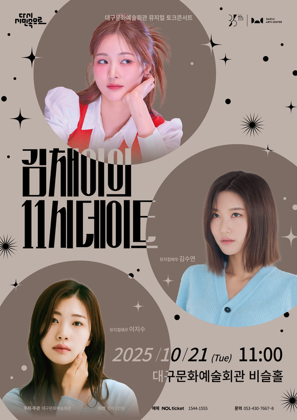 대구문화예술회관이 선보이는 뮤지컬 토크 콘서트 <김채이의 11시 데이트>가 오는 10월 21일(화) 오전 11시, 대구문화예술회관 비슬홀에서 열린다.