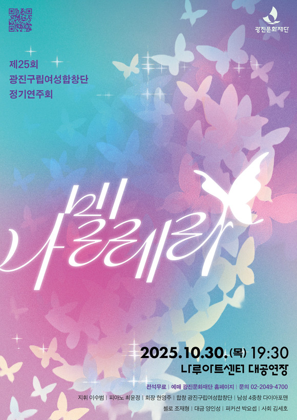 이번 제25회 광진구립여성합창단 정기연주회 <나빌레라>는 전석 무료로 전 연령 누구나 관람할 수 있으며, 광진문화재단 홈페이지를 통해 예약 가능하다.