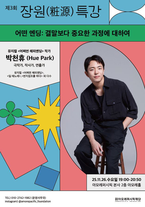 이번 특강은 인문문화축제를 맞아 11월 ‘문화가 있는 날’에 진행하며, 일반 시민 누구나 무료로 참여 가능하다. 참가 신청은 16일까지 아모레퍼시픽재단 공식 인스타그램에서 진행되며 추첨을 통해 참가자를 선정한다. 특강에 참여한 참가자를 대상으로 뮤지컬 어쩌면 해피엔딩을 실제로 관람할 수 있는 관람권 증정 이벤트도 현장에서 진행할 예정이다.