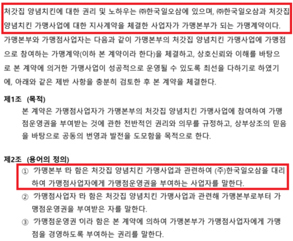 처갓집양념치킨 가맹계약서에는 “처갓집양념치킨 권리와 노하우는 한국일오삼에 있으며, 한국일오삼과 지사계약을 체결한 사업자가 가맹본부가 된다”고 명시돼 있고, 제2조에서도 “가맹본부는 한국일오삼을 ‘대리’해 가맹점에 운영권을 부여하는 사업자”라고 규정돼 있다.
