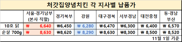 10호 닭은 본사 직할지사인 서울·경기남부가 6640원으로 가장 비쌌고, 강원 지역은 6280원으로 가장 낮아 360원 격차가 났다. 순살 700g(다리살 350g, 가슴살 350g 혼합) 역시 서울·경기남부는 8630원, 강원 지역은 8290원으로 340원 차이가 발생했다.