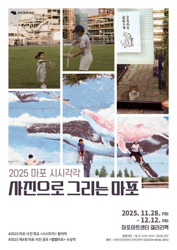 마포문화재단(대표이사 고영근)은 오는 11월 28일(금)부터 12월 12일(금)까지 마포아트센터 갤러리맥에서 <사진으로 그리는 마포> 사진전을 개최한다. 이번 전시는 ‘2025 마포 사진학교 시시각각(時時·覺·刻)프로젝트’(이하 ‘시시각각’)의 참여자들이 직접 마포 곳곳을 탐방하고 담아낸 사진 작품들과 사진 공모 <별별마포>의 수상작을 한자리에서 선보인다.