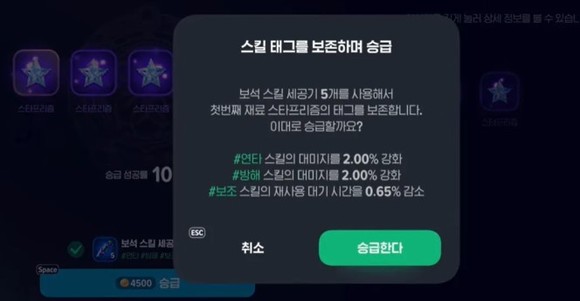 그러나 ‘스타프리즘S’를 ‘온전한 스타프리즘’으로 승급한 후에도 기존 ‘스킬 태그’ 옵션을 유지하려면 보석 하나당 세공기 5개를 추가로 사용해야 한다.