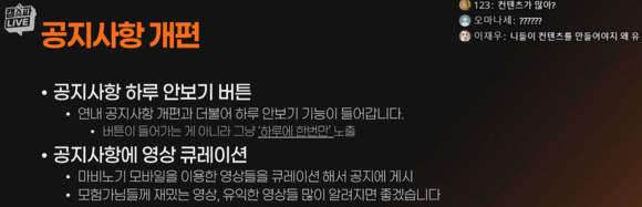 불편이 정점에 달했음에도 문제 해결은 미뤄졌고, 이번 방송에서도 이진훈 디렉터는 “연내 공지사항 개편과 함께 ‘하루에 한 번만 공지가 노출’되도록 준비 중”이라고만 밝혔다.