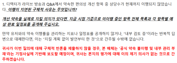 실제로 본지는 넥슨 측에 “디렉터가 라이브 방송과 Q&A에서 약속한 편의성 개선 항목 중 상당수가 아직까지 이행되지 않은 이유가 무엇인지” 질의했지만, 이 역시 어떤 답변도 받지 못했다.
