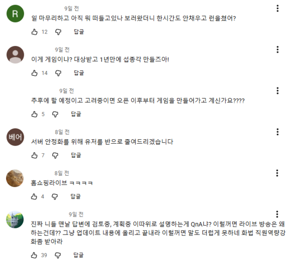 일부 커뮤니티에서는 “이건 소통이 아니라 쇼통”, “홈쇼핑 방송과 뭐가 다르냐”는 날 선 비판이 이어지고 있다. 심지어 “게임대상 받고 싶다고 노래 부르더니, 막상 받고 나니 기고만장해져 유저를 개·돼지 취급하는 것 아니냐”는 격한 반응까지 등장한 상황이다.