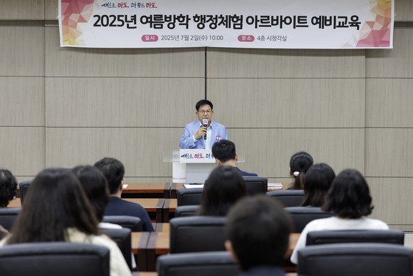 2025년 여름방학 행정체험 아르바이트 예비교육에서 인사말을 전하는 박강수 마포구청장 사진=마포구청