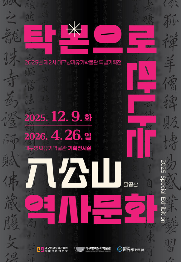 (재)대구문화예술진흥원 박물관운영본부 소속 대구방짜유기박물관은 올해 두 번째 특별기획전으로 ‘탁본으로 만나는 팔공산 역사문화’를 12월 9일(화)부터 2026년 4월 26일(일)까지 방짜유기박물관 기획전시실에서 개최한다.