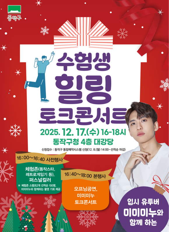 서울 동작구(구청장 박일하)가 오는 17일(수) 오후 4시, 구청 4층 대강당에서 관내 고3 수험생 등 400여 명을 대상으로 ‘힐링 토크콘서트’를 개최한다고 밝혔다.