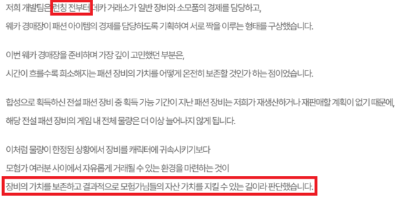 이번 안내문에는 “런칭 전부터 데카 거래소는 일반 장비·소모품을, 웨카 경매장은 패션 아이템 경제를 담당하도록 기획했다”고 적혀 있다. 그러나 이는 넥슨이 과거 공지에서 강조해 온 ‘획득 불가’ 안내와 논리적으로 양립할 수 없는 주장이다.