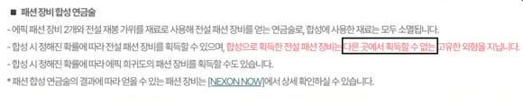 앞서 넥슨은 전설 패션장비 ‘코스믹 스타차일드’, ‘엘더우드 소버린’ 판매 당시 “정기점검 전까지만 획득할 수 있다”, “종료 일정 이후에는 획득할 수 없다”, “합성으로 획득한 전설 패션장비는 '다른 곳에서' 획득할 수 없다”는 확정적 표현을 반복 사용했다.