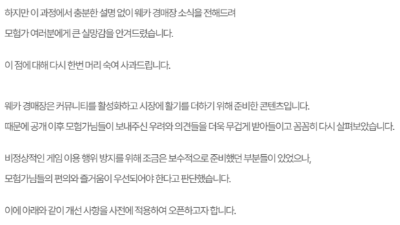 결국 넥슨은 핵심을 교묘하게 비껴간 “사과”와 “개선”을 내세워, 웨카 경매장 강행을 선언하는 면피용 공지를 ‘사과문’처럼 포장해 통보했다.