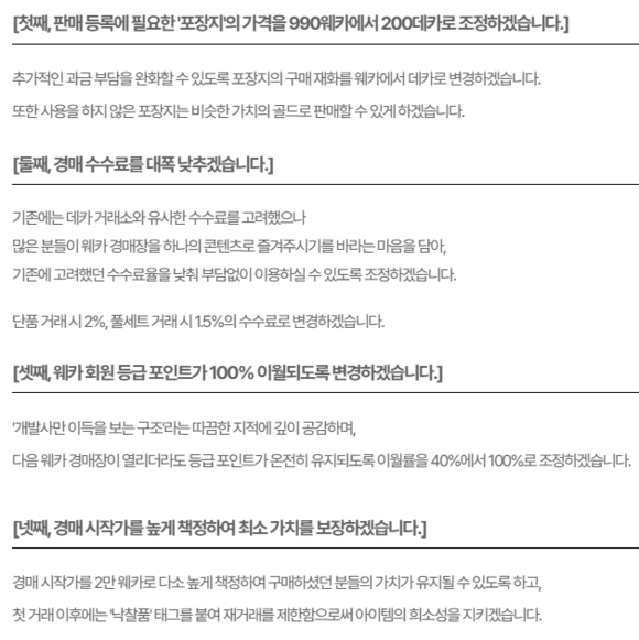 또 “경매 시작가를 2만 웨카(약 20만원)로 높여 가치를 보존하겠다”는 주장도 논란을 피할 수 없다. 전설 패션장비 중에는 시장 가치가 2만 웨카 이하인 것도 존재한다. 그럼에도 시작가가 2만 웨카로 고정되는 순간, 유저들은 무조건 2만 웨카를 확보해야 한다.