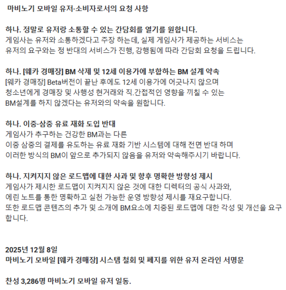 이로 인해 유저들은 단순한 항의를 넘어 집단적인 문제 제기와 요구안을 갖춘 행동에 나서고 있다. 12월 8일 공개된 온라인 성명문에는 이미 3000명 이상이 참여하며, 이번 사태를 단순한 불만 표출이 아니라 넥슨이 반드시 응답해야 할 ‘정식 요구’로 규정했다.