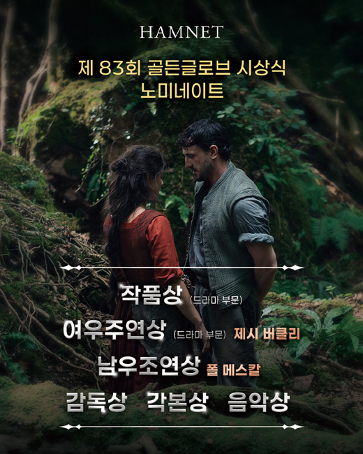 8일(현지 시각) 발표된 골든 글로브 시상식 후보 명단에 따르면 햄넷은 영화 드라마 부문 작품상, 감독상, 여우주연상, 그리고 남우조연상, 각본상, 음악상까지 총 6개 부문에 이름을 올렸다.