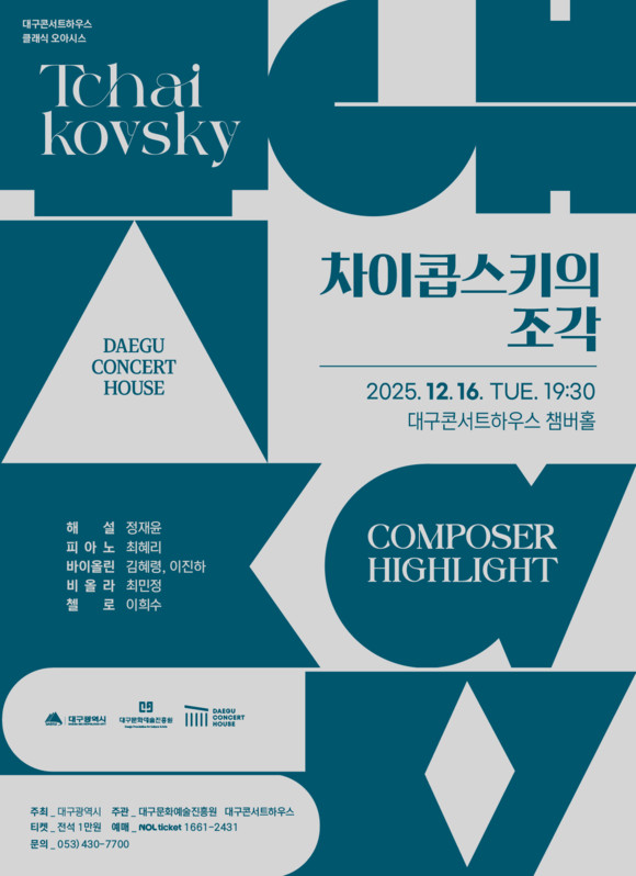 클래식 음악사를 대표하는 작곡가들을 깊이 있게 탐구하는 대구콘서트하우스의 ‘컴포저 하이라이트(Composer Highlight)’ 시리즈가 12월에는 러시아 낭만주의의 거장 표트르 일리치 차이콥스키(Pyotr Ilyich Tchaikovsky)를 주제로 찾아온다. 12월 16일(화) 19시 30분 대구콘서트하우스 챔버홀에서 펼쳐지는 <차이콥스키의 조각>에서 차이콥스키의 서정성과 극적 감성을 담은 주요 작품들을 실제 연주와 함께 해설로 풀어낸다. 음악 속에 녹아 있는 작곡가의 개인적 정서, 계절과 풍경, 예술적 영감의 순간들을 세밀하게 조명하며 관객들에게 ‘듣는 즐거움’을 넘어 ‘이해하는 감동’을 전한다.