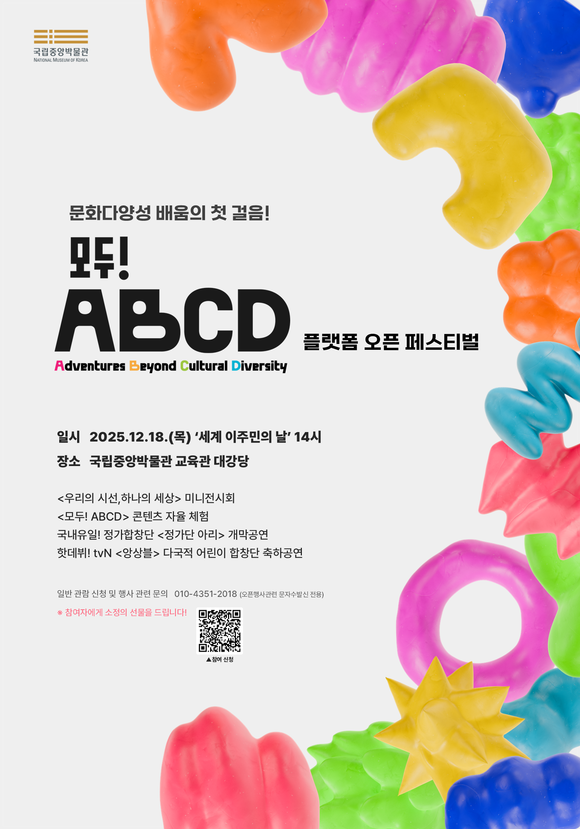 국립중앙박물관(관장 유홍준)은 12월 18일(목) 세계 이주민의 날을 맞아 문화다양성 <모두! ABCD> 플랫폼* 시범운영 기념식을 개최한다. 이번 행사는 다양한 문화적 배경을 지닌 어린이들이 함께 어울리며 서로의 세계를 이해하고, 문화다양성 교육의 가치를 확산하기 위한 취지로 마련되었다.