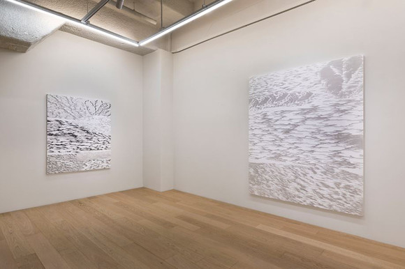신작에서 주로 사용되는 흑과 백은 박철호의 시각 언어를 구성하는 핵심적인 색채다. 이는 물결의 이미지를 직접적으로 환기했던 이전의 푸른 색조에서 벗어나, 해석의 여지를 확장해 보다 추상적인 장을 구축하려는 시도와 맞닿아 있다. ‘Overlap(중첩)’에서 흑과 백은 극적인 대비로 작동하기보다, 농담의 미세한 차이로 나타나며 결의 움직임과 흐름을 한층 선명하게 부각한다.