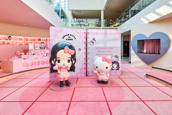 팝업스토어의 테마는 ‘교환일기’다. 헬로키티를 향한 지수의 애정과 헬로키티 특유의 일상적 즐거움을 결합해 두 주인공이 서로 팬이 돼 동경하고 우정을 나누는 서사를 공간 속에 담았다. 방문객이 다이어리·서랍장·화장대 등을 모티프로 구성된 공간을 거닐며 이야기에 몰입할 수 있도록 설계됐다.
