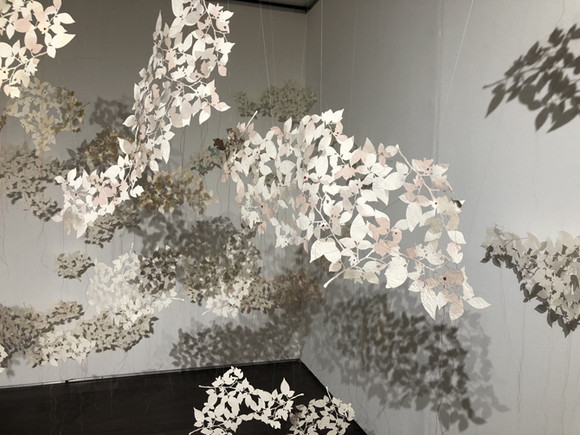 이번 전시에서는 한지를 전시 공간에 구름처럼 흩뿌린 듯한 ‘이해관계’ 작품을 선보였다. 전시 공간을 부유하듯 떠 있는 나뭇잎과 반복된 ‘人(사람 인)’자의 중첩이 인간관계, 서로에게 기대고 얽힌 모습을 상징하는 작업이다.