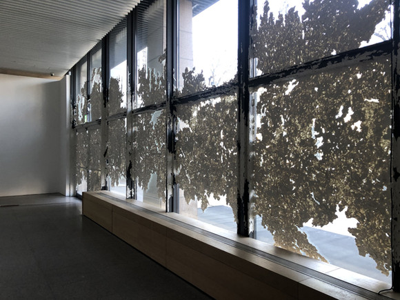 최선아 작가의 ‘진지바’는 스컬피를 건물 외벽에 붙인 작품이다. 멀리서 봤을 땐 하얀 페인트 덩어리 같지만, 작품 가까이 다가갈수록 다른 느낌을 받는다. 최 작가는 손가락으로 눌러 형태를 변형시킬 수 있는 소조 재료인 스컬피를 사용해 14m에 달하는 로비 공간 구조에 덧입혔다. 그래서 손가락 힘의 흔적들이 결과물에 자연스레 남아 있다. 꼭 창이라는 캔버스에 손가락이라는 붓을 통해 스컬피로 그림을 그린 것 같기도 하다. 전시장을 찾은 날은 매우 추웠던 날이라 꼭 창에 눈이 내린 것처럼 보이기도 했다. 해가 뜨고 질 때 생기는 그림자로 인해 아침과 점심, 저녁마다 모두 다른 모습을 보여주는 작품이기도 하다.
