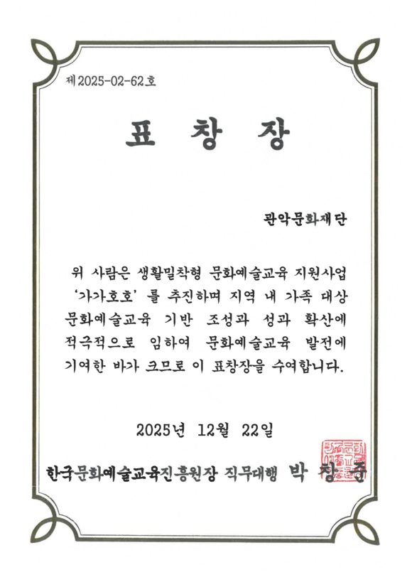 서울 관악문화재단(대표이사 소홍삼)이 한국문화예술교육진흥원이 주관한 '2025 생활밀착형 문화예술교육 지원사업 가가호호'의 운영 성과를 인정받아 기관 표창을 수상했다.