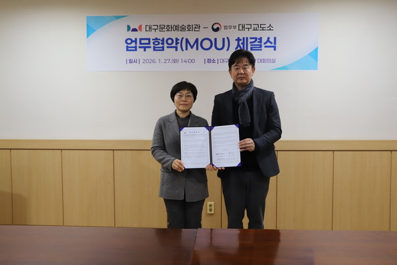 (재)대구문화예술진흥원 대구문화예술회관은 대구교도소와 수용자의 정서 안정과 심성 순화를 위한 문화예술 프로그램 협력을 강화하고자 1월 27일 업무협약(MOU)을 체결했다고 밝혔다.