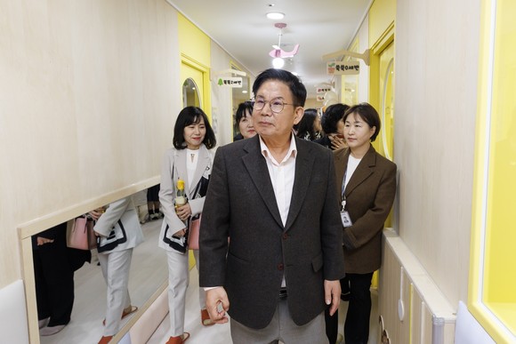 공덕베이비시터하우스를 둘러보고 있는 박강수 마포구청장. 사진=마포구청