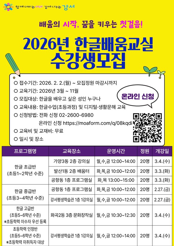 한글을 배우고 싶은 강서구 거주 성인이면 누구나 신청할 수 있고, 정원 마감 시까지 전화 및 온라인으로 접수하면 된다. 수업료와 교재는 전액 무료다.