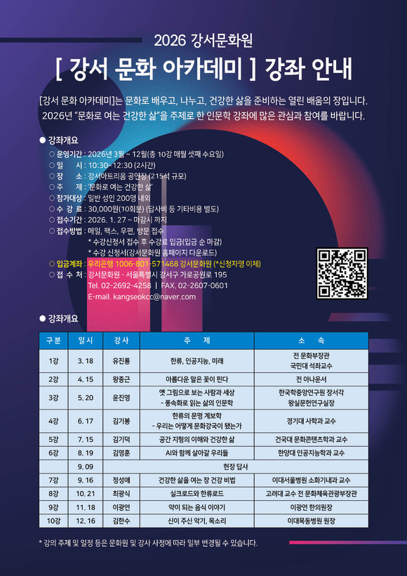 서울 강서구(구청장 진교훈) 강서문화원(원장 김진호)은 오는 3월부터 12월까지 주민들의 인문학적 역량을 키우고 건강한 삶을 위한 ‘2026 강서 문화 아카데미’를 개최한다고 밝혔다.
