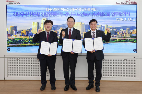 서울 강남구(구청장 조성명)가 13일 구청에서 ㈜신한은행 강남영동본부, 강남구 노인복지기관협의회와 3자 업무협약을 체결하고 어르신 금융역량 강화 교육을 추진한다. 이번 협약은 디지털 금융환경 변화에 따른 어르신들의 금융 소외를 예방하고, 보이스피싱 등 금융사고로부터 안전한 일상을 지원하기 위해 마련됐다.