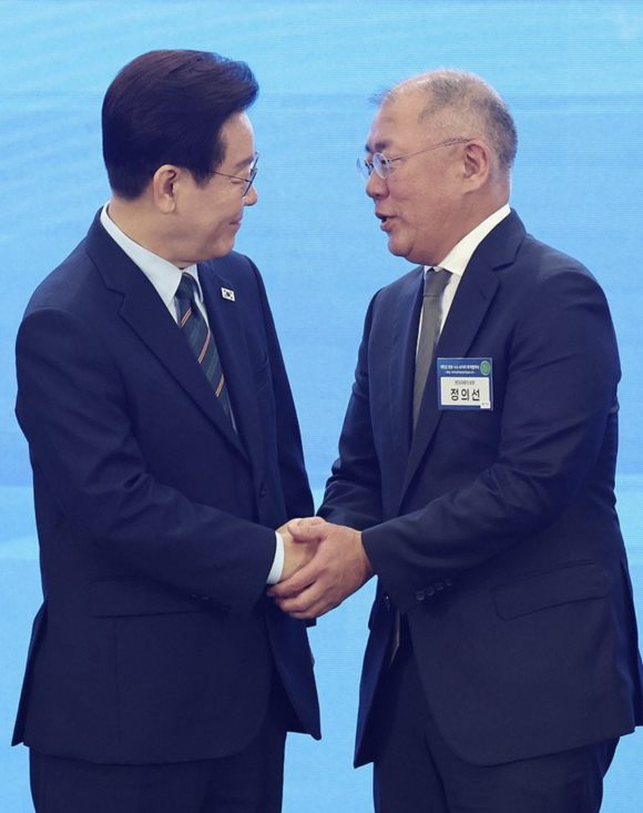 지난달 27일 전북 군산새만금컨벤션센터에서 이재명 대통령이 정의선 현대자동차그룹 회장의 손을 맞잡았다.
