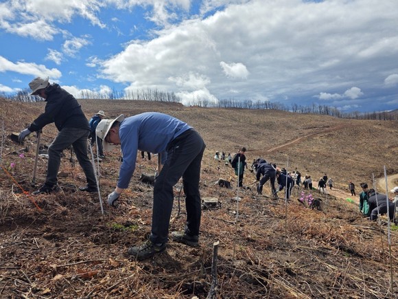 SKT와 유한킴벌리 임직원·가족 100여 명이 안동 산불 피해 지역에서 나무심기 활동을 하고 있다. 사진=SK텔레콤