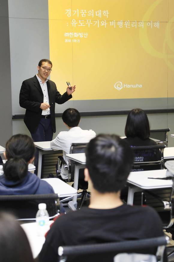 특히 학생들 사이에서 인기가 높았던 ‘유도 미사일 기초 기술의 이해’ 강좌에서는 ㈜한화가 자체 개발한 첨단 유도무기인 ‘230mm급 다련장 천무’의 연구개발에 참여한 ㈜한화 소속 직원이 강사로 나서 유도무기와 비행원리의 이해, 방산업체가 제작하는 유도무기 종류 등의 내용을 강의했다. 한화 측은 학생들이 일상생활에서 접하기 어려운 방위산업 관련 첨단기술 및 업계 동향 등을 듣고 진로를 탐색해볼 수 있는 시간이었다고 전했다.