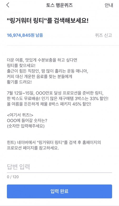 모바일 금융 애플리케이션 '토스'는 이날 '7월 12일~15일, OOO만포 달성 프로모션을 준비한 링티, 한 박스도 무료배송! 인기 많은 재구매템 3박스는 33% 할인! 올여름을 든든하게 채울 8박스 패키지 45% 할인! 여기서 OOO에 들어갈 숫자는?' 이라는 내용의 행운퀴즈를 제시했다.