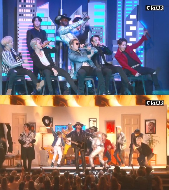 이날 공연은 BTS 외에도 그간 ‘올드 타운 로드’ 리믹스 작업에 피처링으로 참여했던 빌리 레이 사이러스, 래퍼 영턱, 나스, 어린이 가수 메이슨 램지 등이 함께 무대에 오른 올스타 버전이었다.