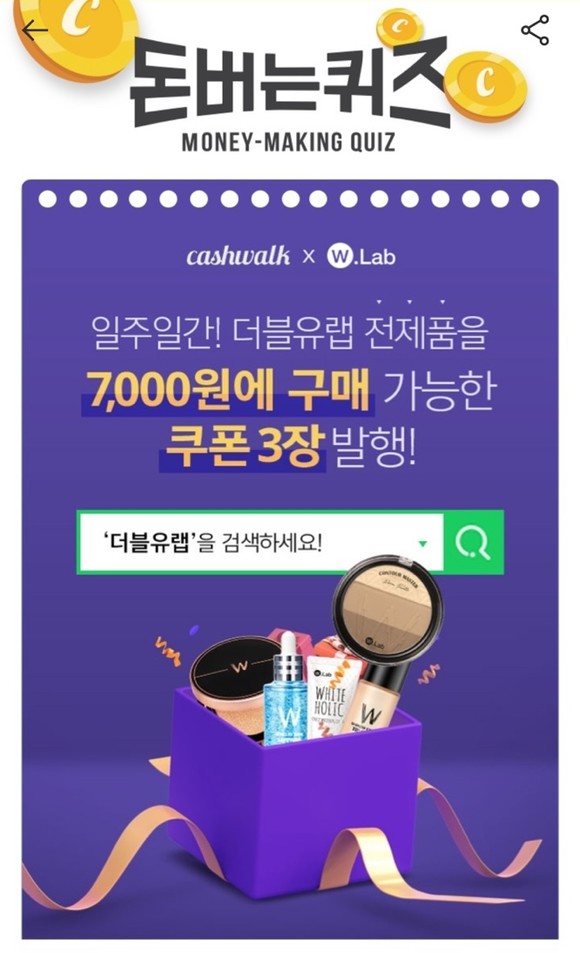 ‘더블유랩’(W.Lab)에 관한 캐시워크 돈버는 퀴즈가 출제됐다.